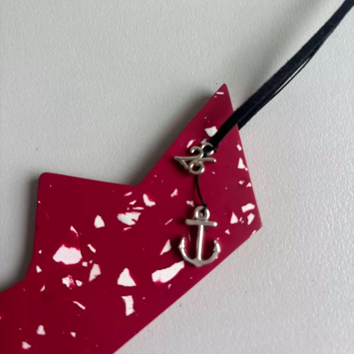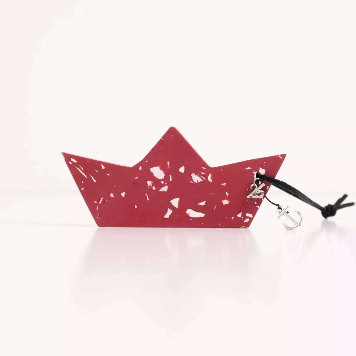This boat is inspired by the classic paper origami shape. The metallic anchor charm and black cord add a nautical touch and a symbolism of stability, hope, and good fortune.